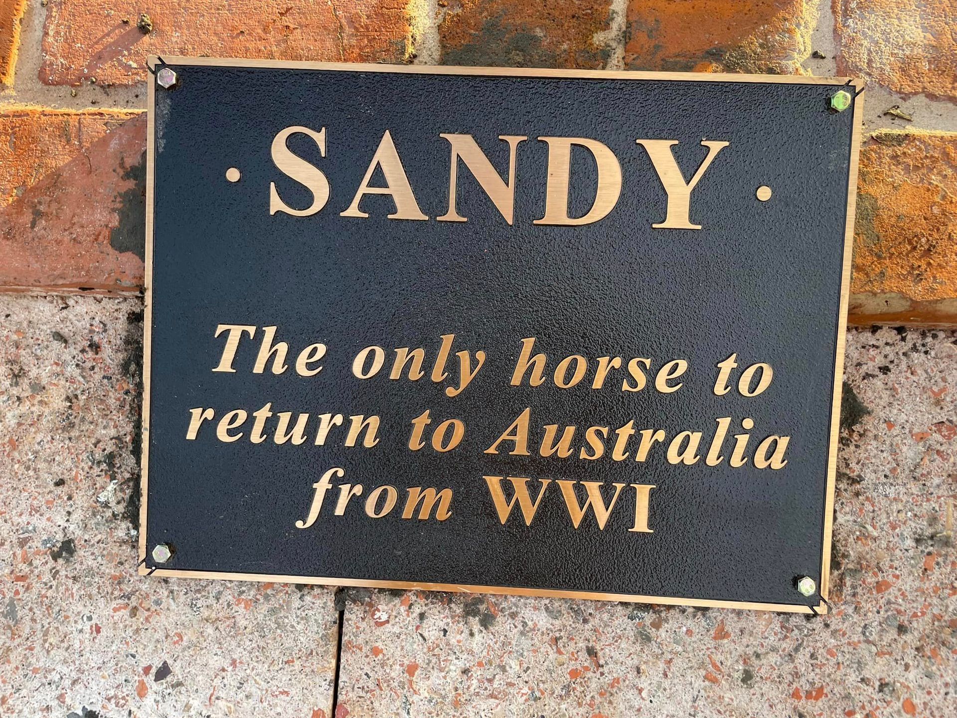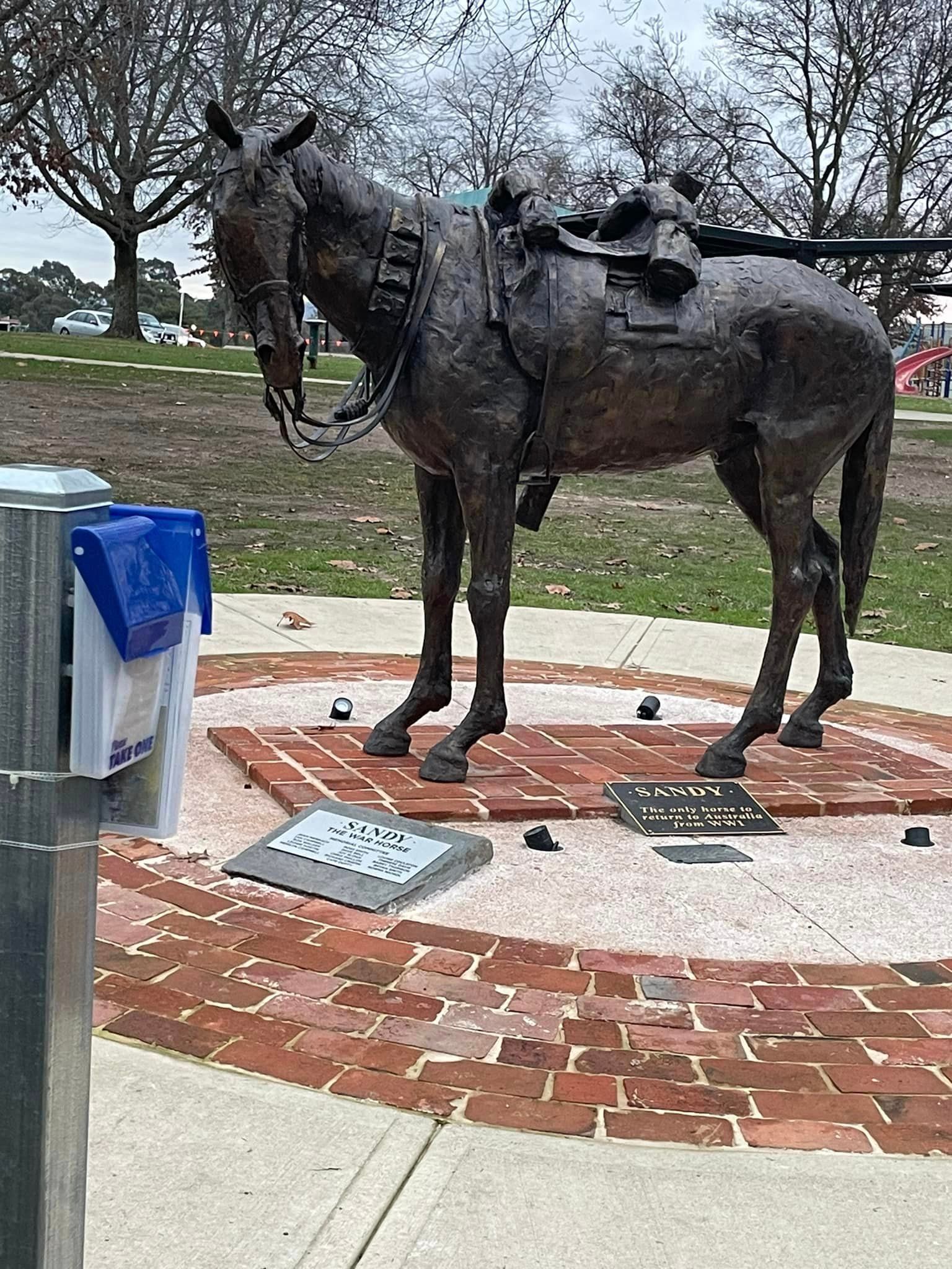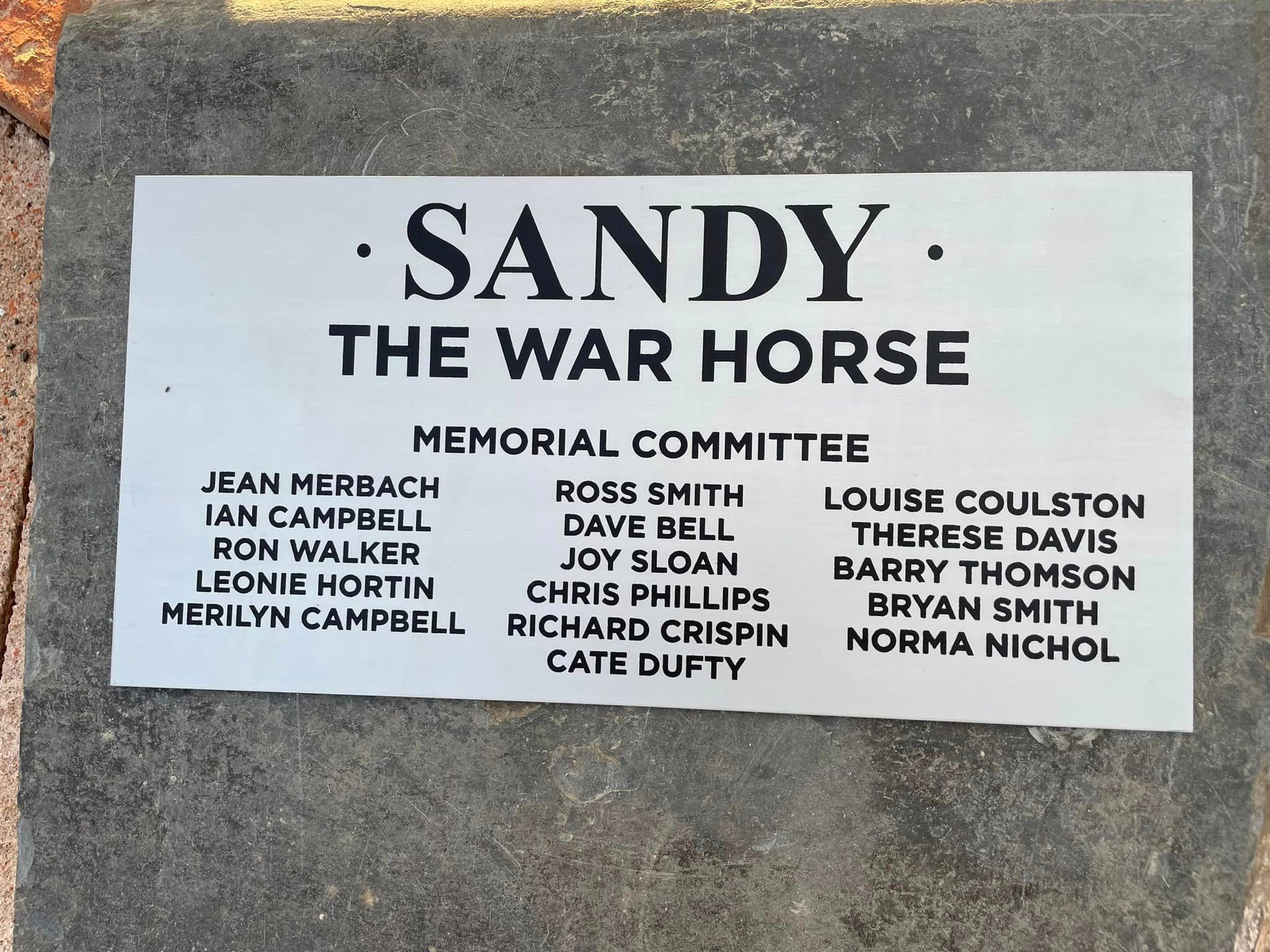 The Sandy the war horse Memorial Committee together with the Tallangatta community and other equine organisations, the Towong Shire Council and the Bendigo Bank raised over $200,000. dollars to build this life sized bronze statue of Sandy. The unveiling event was held on the 20th May 2023 100 years since the death of Sandy On the day of the unveiling two hundred horse men and women formed a guard of honour in memory of the horses that did not come home.