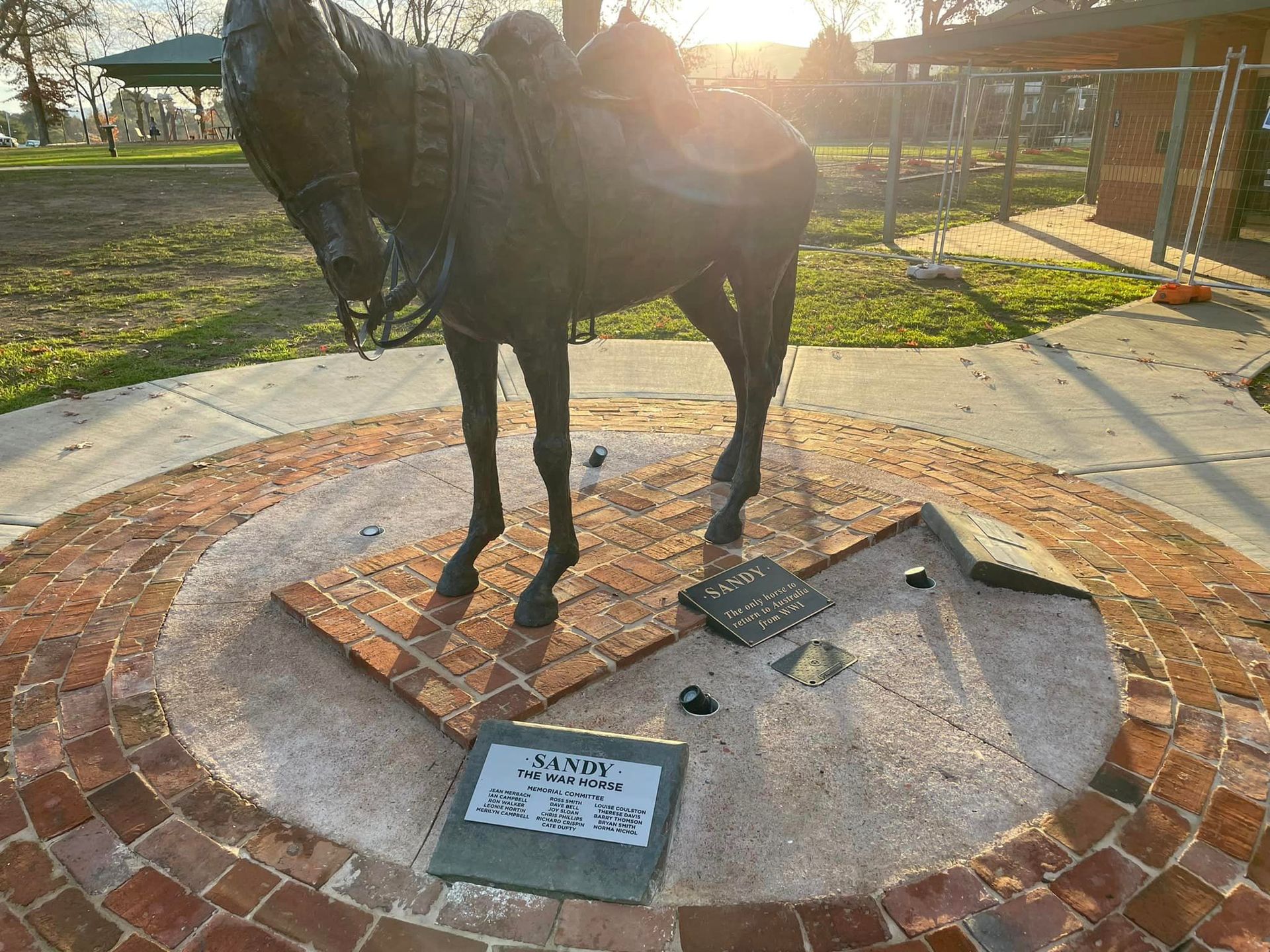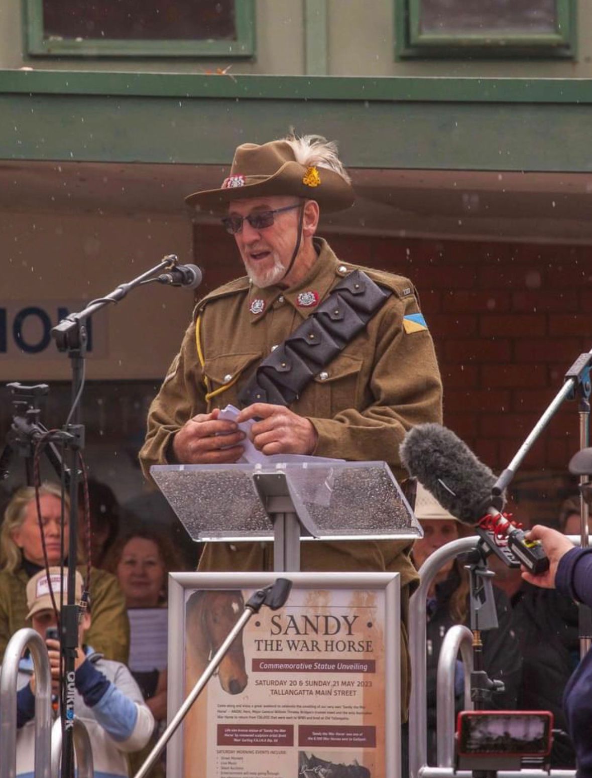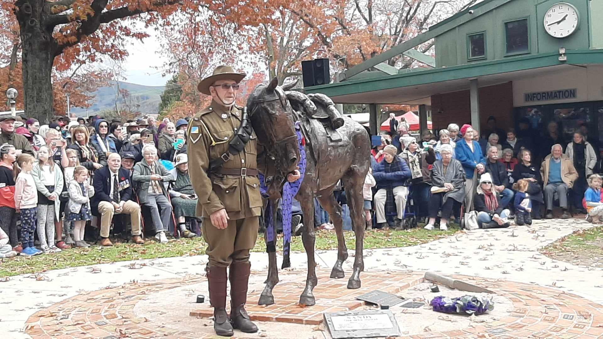 The Sandy the war horse Memorial Committee together with the Tallangatta community and other equine organisations, the Towong Shire Council and the Bendigo Bank raised over $200,000. dollars to build this life sized bronze statue of Sandy. The unveiling event was held on the 20th May 2023 100 years since the death of Sandy On the day of the unveiling two hundred horse men and women formed a guard of honour in memory of the horses that did not come home.